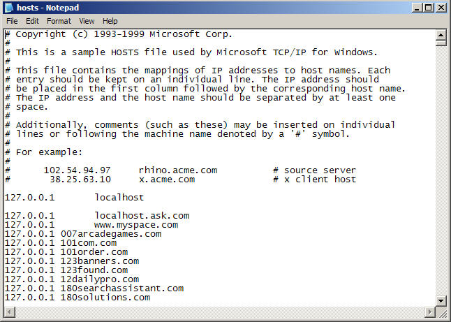 A Low Tech Approach to Web Site Access Prevention: So - you fake your computer out by telling it that the address of a questionable web site is 127.0.0.1. The address 127.0.0.1 is a special address - it is the loop-back address of your own computer. Regardless of what address your Internet Service Provider assigns you, your computer's internal address is always 127.0.0.1. When you tell the HOSTS file that the address of a questionable web site, such as www.badpornsite.com is actually 127.0.0.1, your web browser will try to go to that address, find out it is not a web server, and simply display the plain white "Page not found" error that you get when you try to go to a web site that doesn't exist. I'm not necessarily trying to pick on MySpace, by the way - but they have been singled out lately as one of the most popular sources that many online predators look to for victims, so I have chosen to simply use it as an example if you wish to block it on your system.